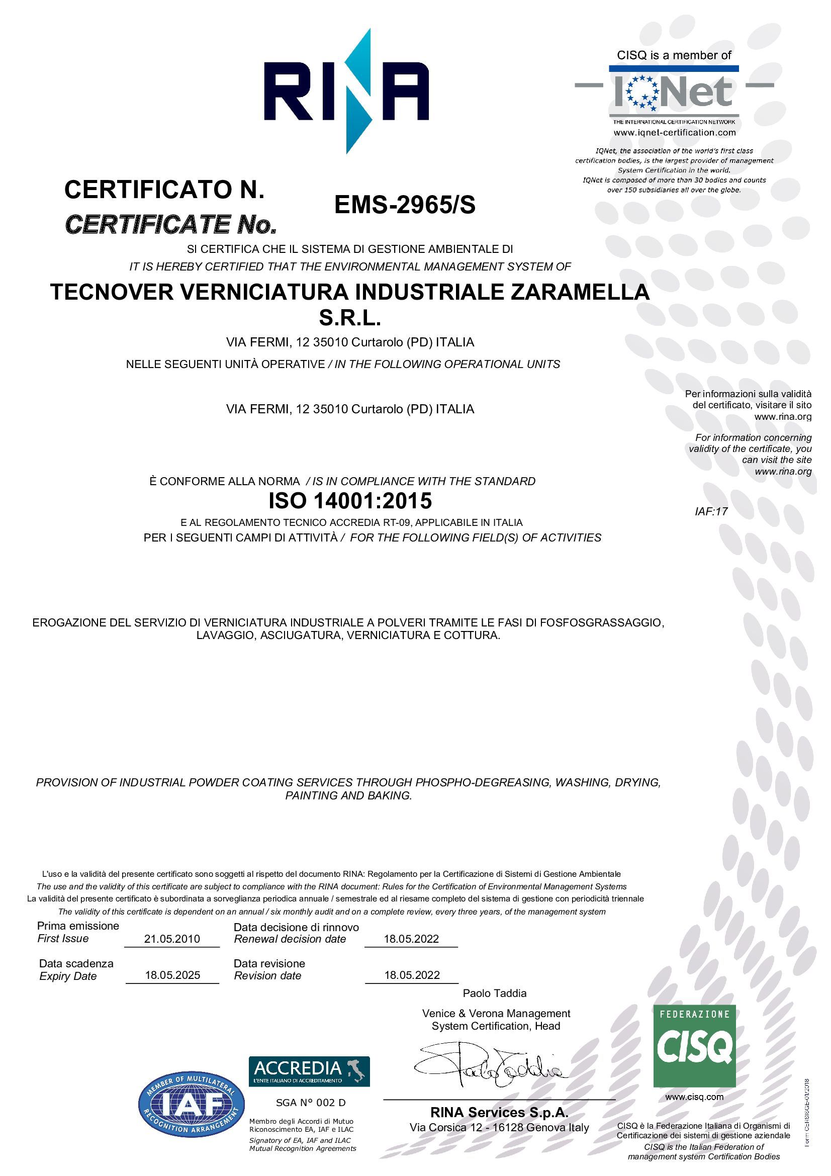 Oltre alla ISO 9001, un’altra certificazione molto importante di cui è in possesso l’azienda Tecnover è la ISO 14001, relativa a norme europee che impongono la gestione ottimale degli aspetti ambientali.