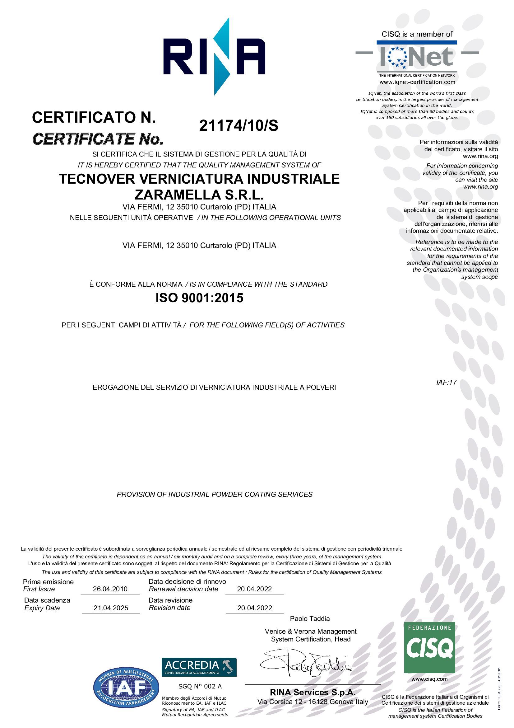 La qualità, intesa come soddisfazione delle aspettative del Cliente, e la salvaguardia dell’ambiente sono le priorità perseguite da Tecnover Verniciatura Industriale Zaramella s.r.l., che assume i seguenti impegni: