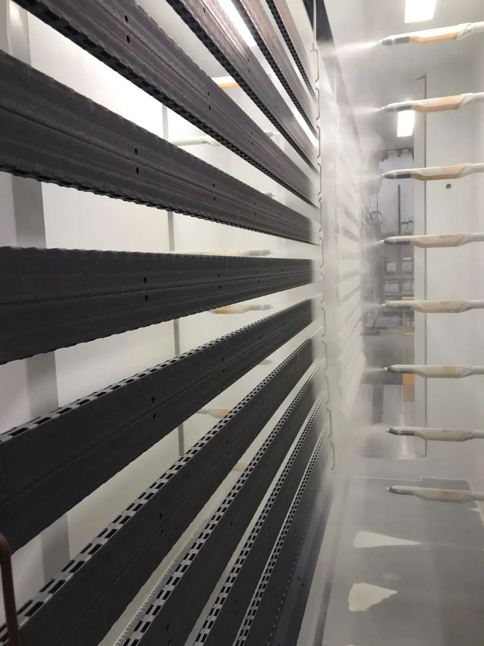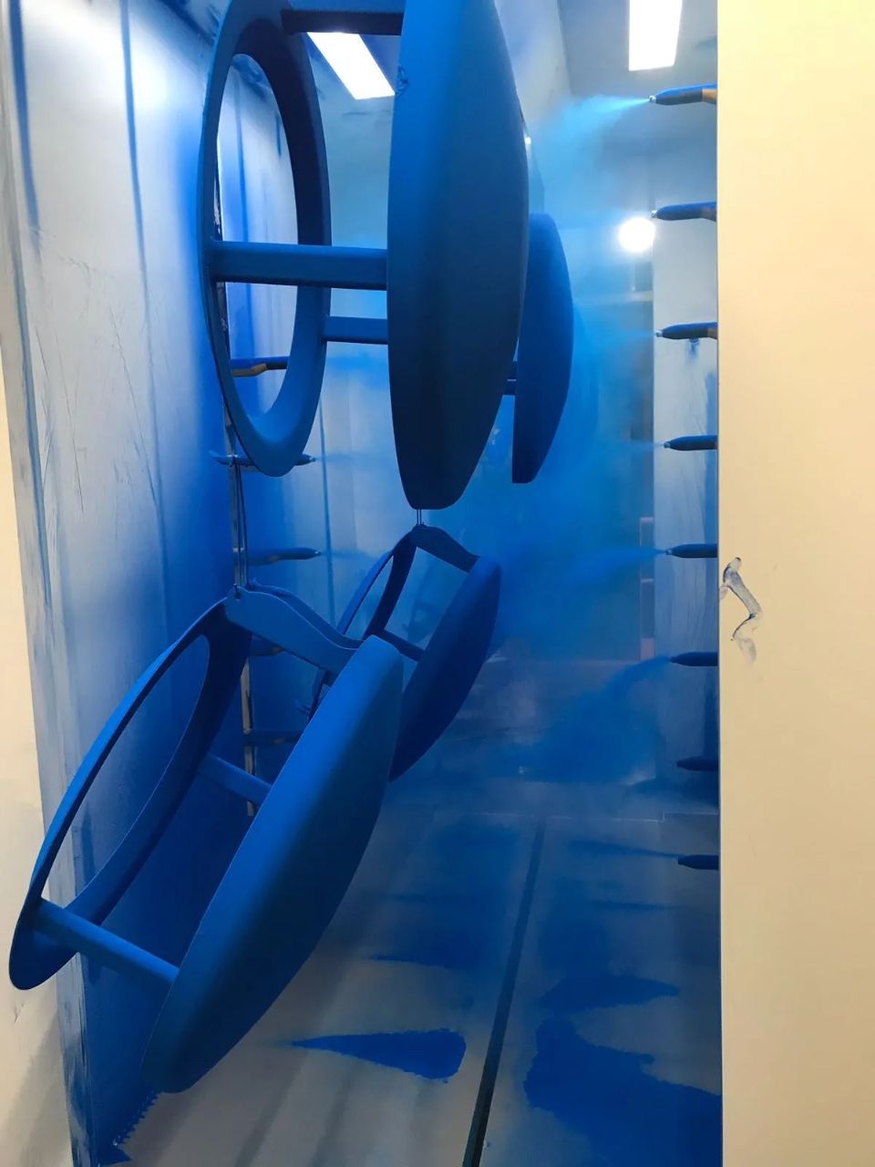 Per la verniciatura viene utilizzata una pistola a carica elettrostatica di ultima generazione, grazie alla quale è possibile effettuare l’erogazione su uno strato che va dagli 80 ai 100 micron per una copertura uniforme del supporto. Infine, la materia prima che non è stata utilizzata confluisce in un apposito impianto di recupero che ne evita la dispersione.